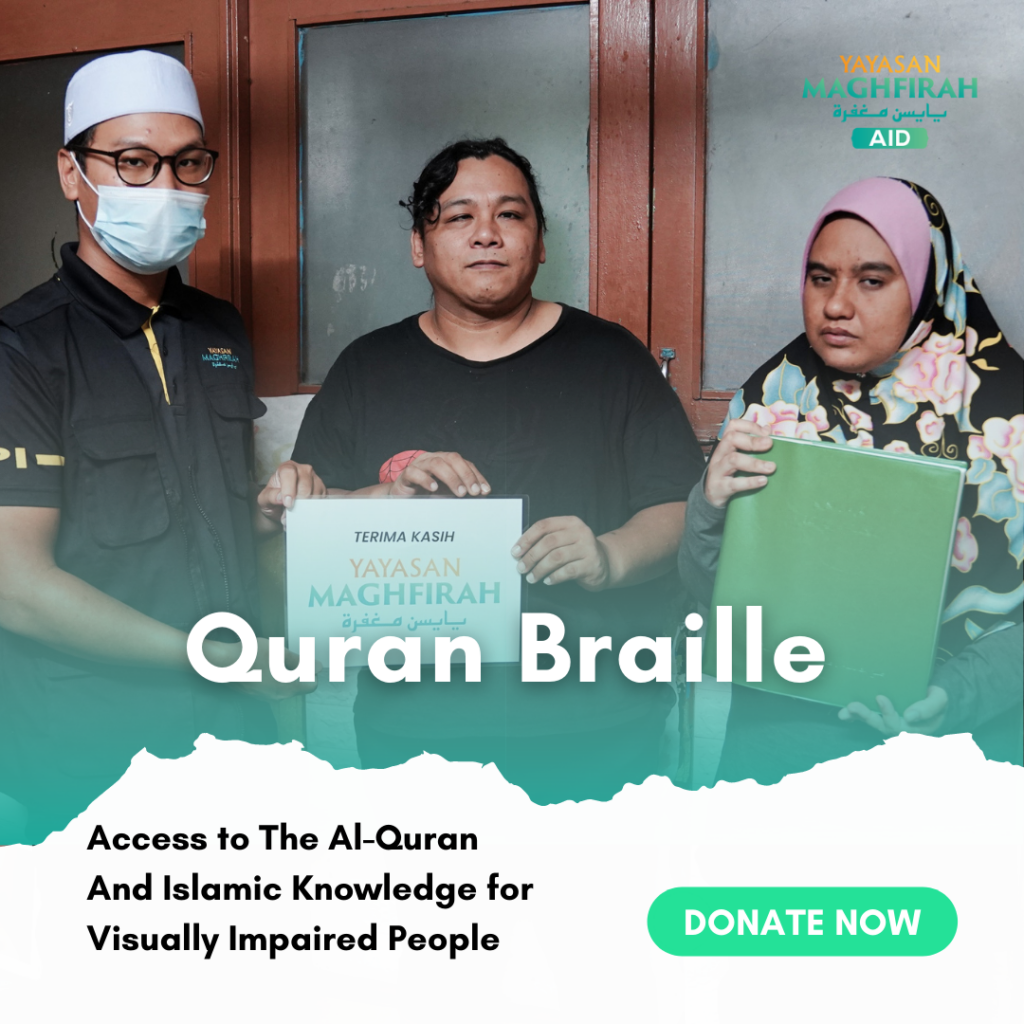 Many blind persons in Malaysia continue to struggle with memorizing the Quran due to the high cost of purchasing a Braille Quran. Thanks to your donation to the Braille Qur’an, many blind Muslims can learn the Qur’an, and every line of the Holy Qur’an that they recite will bring you everlasting reward even after you die.